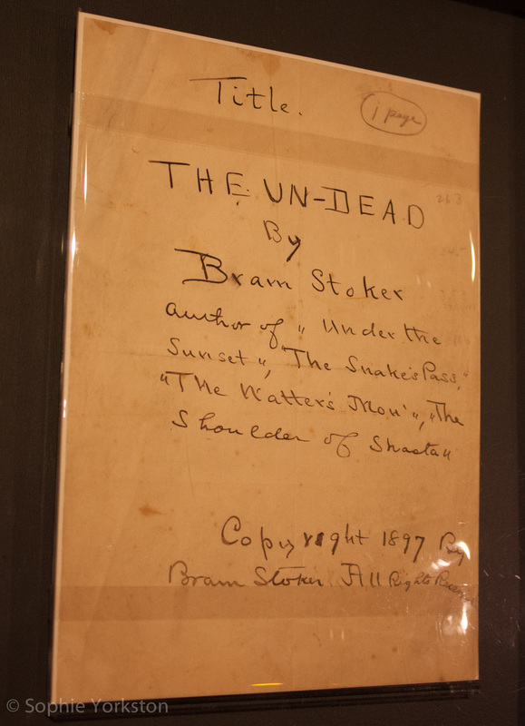 Walking into the Can’t Look Away: The Lure of Horror Film exhibit was quite a change from previous exhibits: a darkened room, splattered with red, full of shadows cast by knotted and thorny booths, a shrieking in the background. Curated by some of the preeminent names in horror film—Roger Corman, John Landis, Eli Roth—it is an expansive and inclusive exhibition. In individual booths, crafted to look like twisted plants, you can watch selections of iconic horror films. There’s a display of famous pieces, like the chair from Hostel, the murderer’s mask from the Scream movies. One wall dominates, describing the canon of creatures like zombies and vampires. There’s even original manuscripts: Bram Stoker’s Dracula original edited draft is on display.