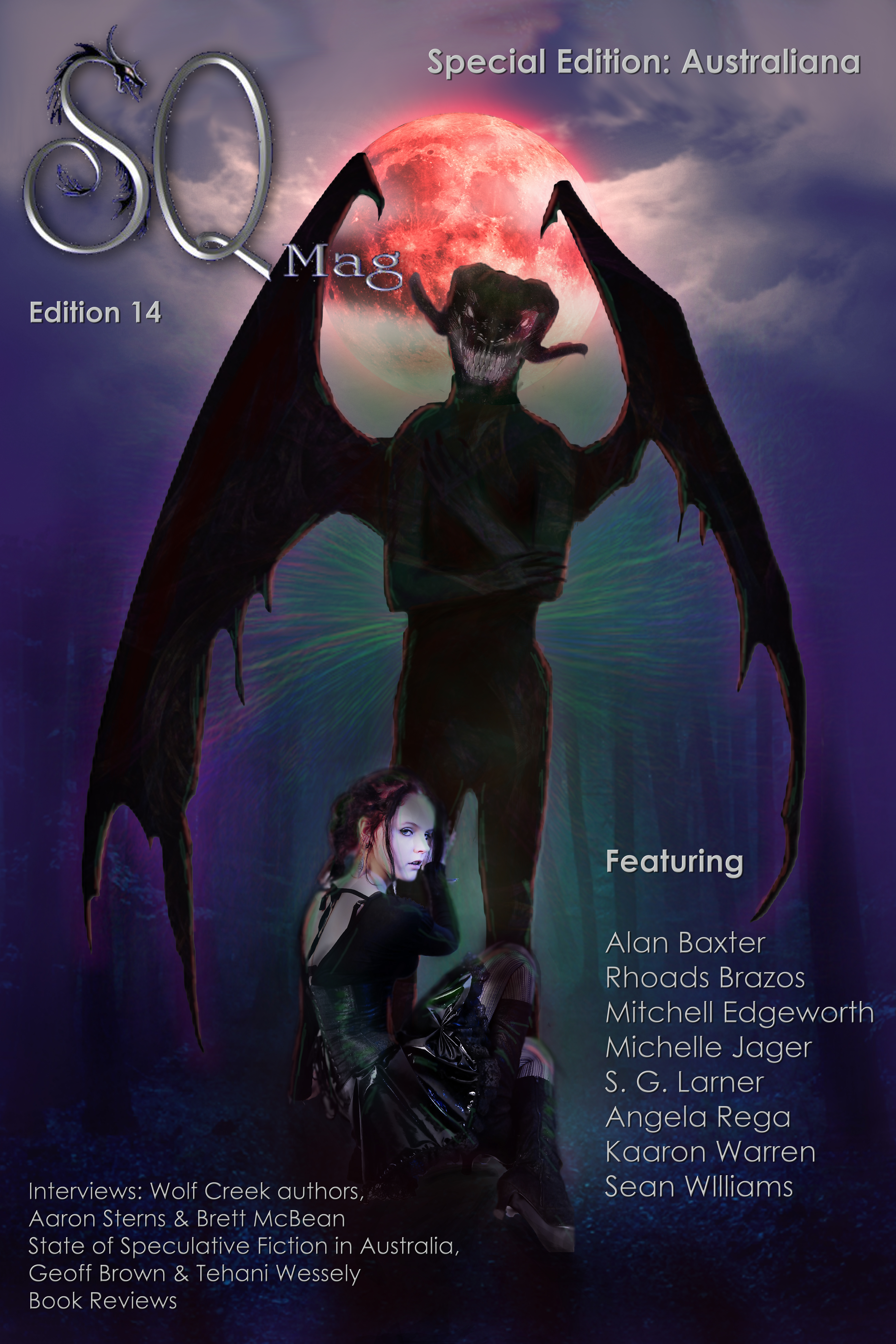 Special mention should be given to the authors: Angela Rega, Alan Baxter, Mitchell Edgeworth, Kaaren Warren, Rhoads Brazos (whose story was included in Ellen Datlow’s Year’s Best Horror Volume 7), Sean Williams, S. G. Larner, and Michelle Jager (a finalist for best short story in the same awards). Also, Geoff Brown and Tehani Wessely, for their excellent articles on the state of play of speculative fiction in Australia, Mysti Parker and Damien Smith for their book reviews, and finally, but not least, Jeffery Doherty for his amazing cover art.